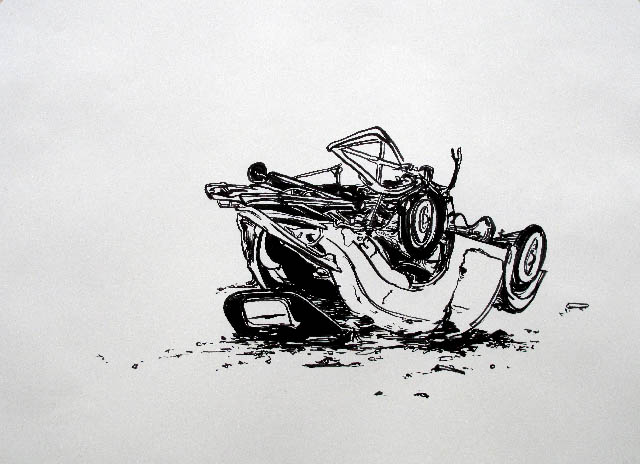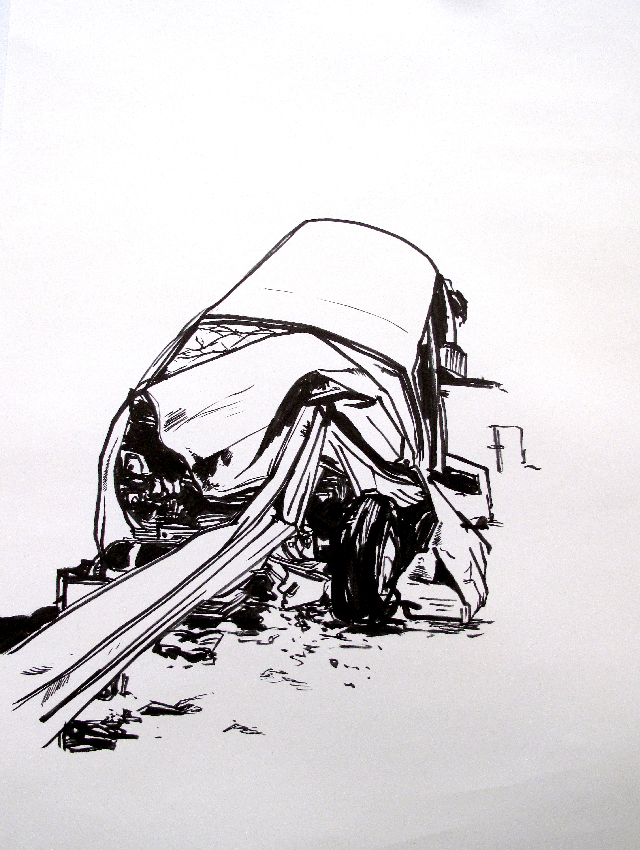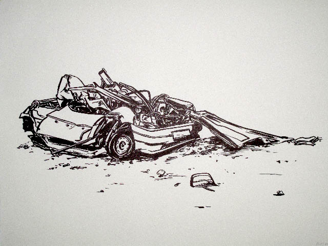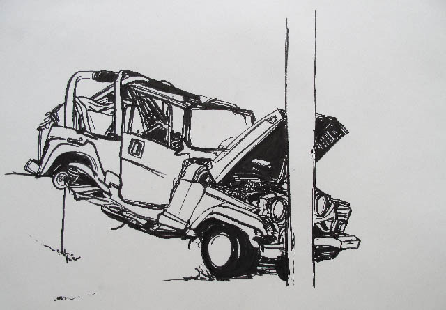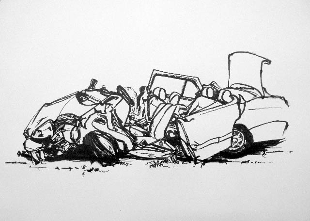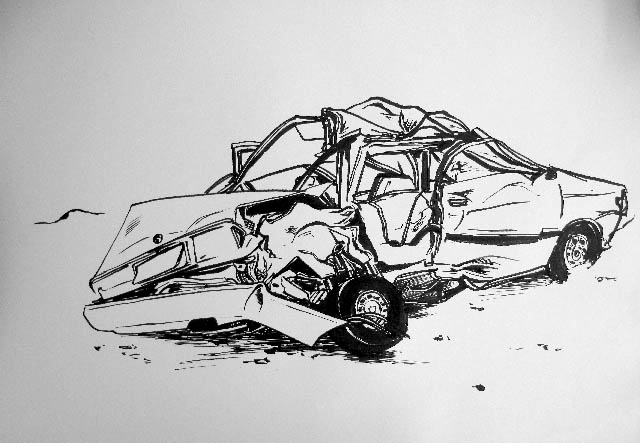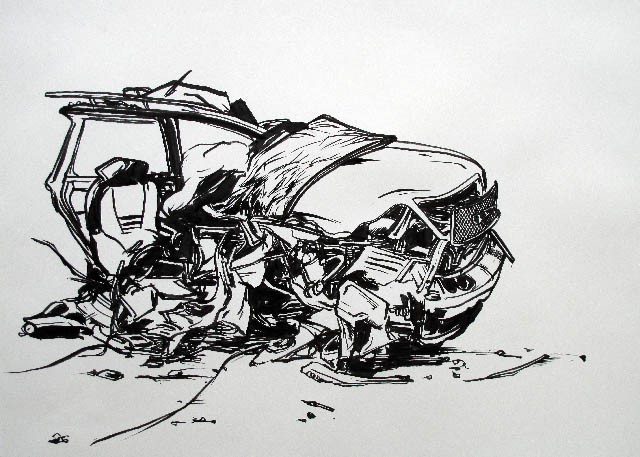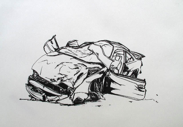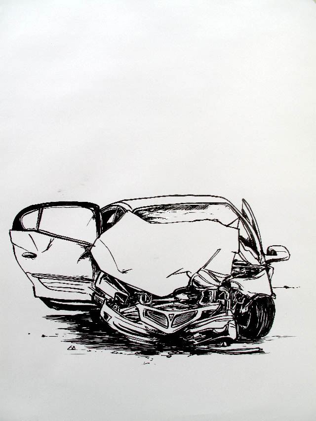 A series of crashed cars made in 2009, Ink on paper, 65 by 48 cm.