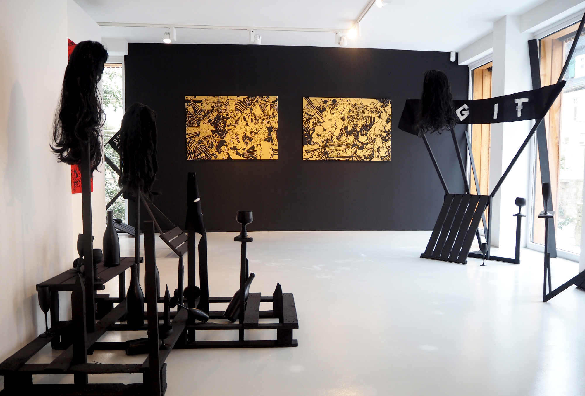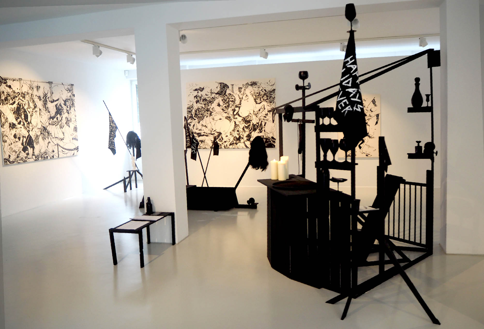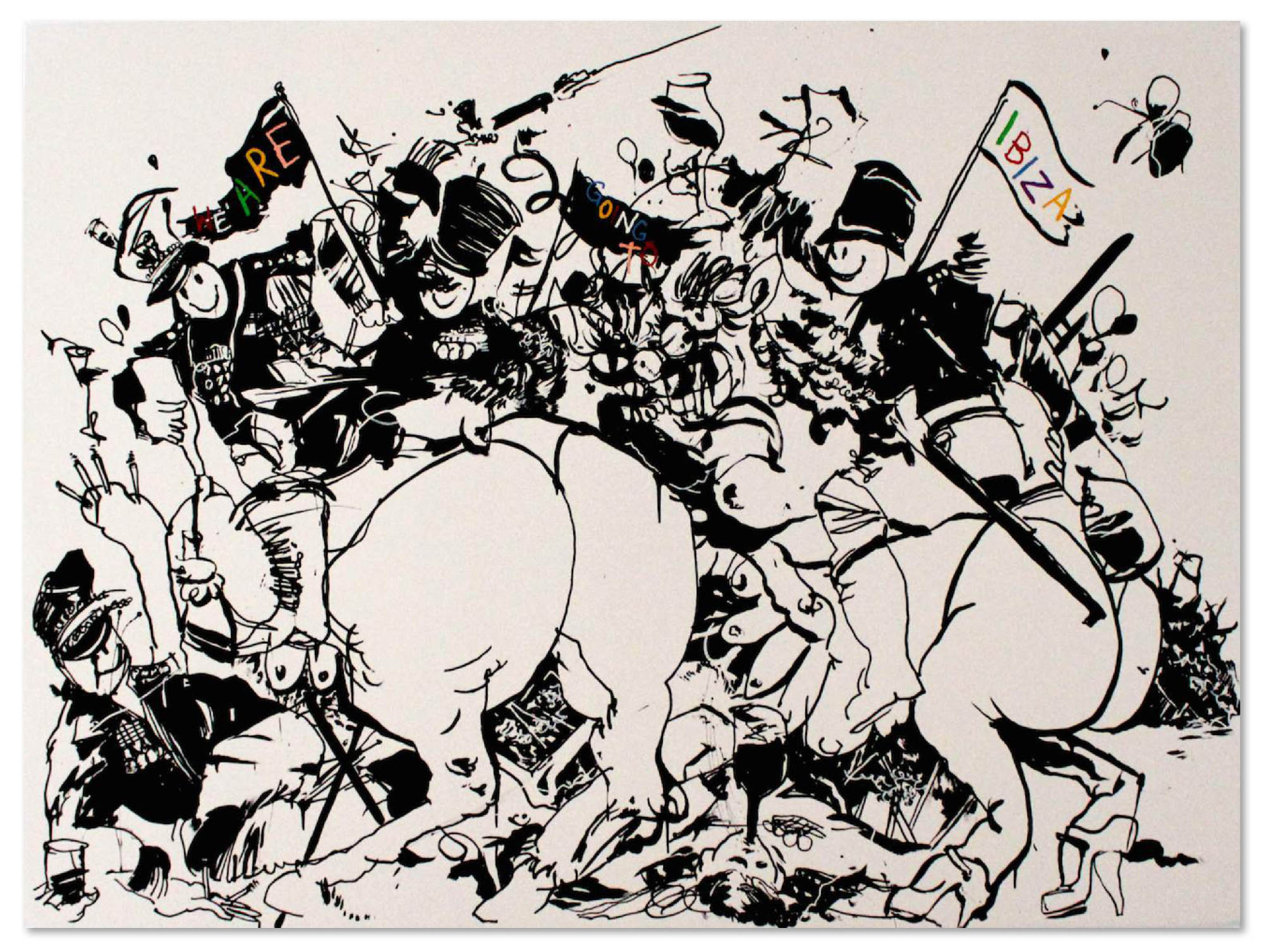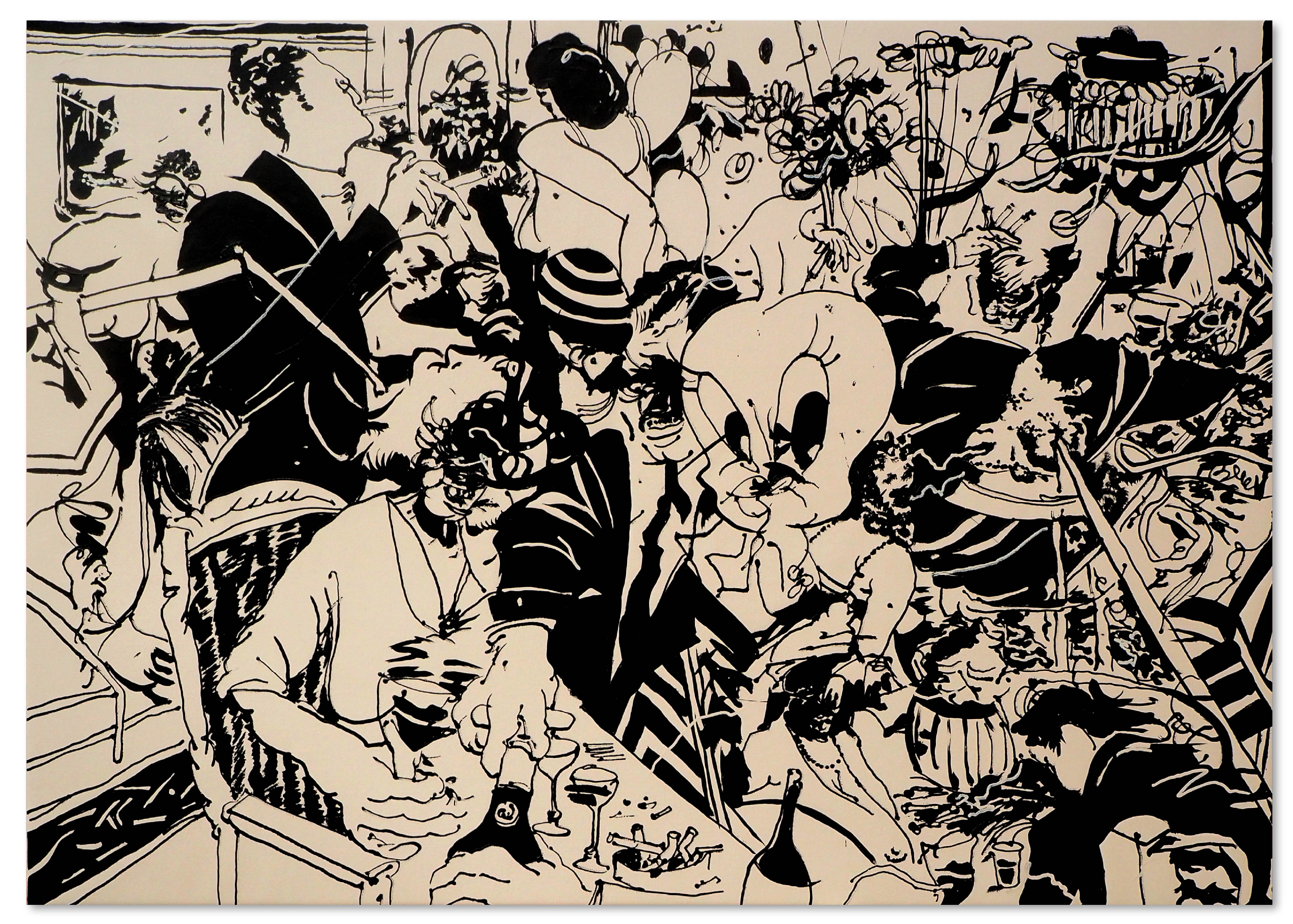 Black colour lines, quickly, unclean and occasionally with solidly material density applied, branches to abstract forms by closer examination and only matures into more specific images with increasing distance. Although the scenery then can be deciphered clearer, it isn’t more tangible. Agglomerations of people, whose faces are distorted, seem to be cooped up within the artwork frames, like in a very confined space. Only slowly it is possible to identify individual scenes, as settings over settings merge together, like a big party where you try to find your lost companion. In general the scene seems to imitate a perfect moment, which is positive, exaggerated joyful and most of all decadent. Happy Holidays Forever – as the title of the exhibition indicates, the viewer finds himself situated within a venue full of lust, luxury and enthusiasm. But with a closer look, the event becomes fragile and the figurative image breaks up into rough, uncontrolled lines.