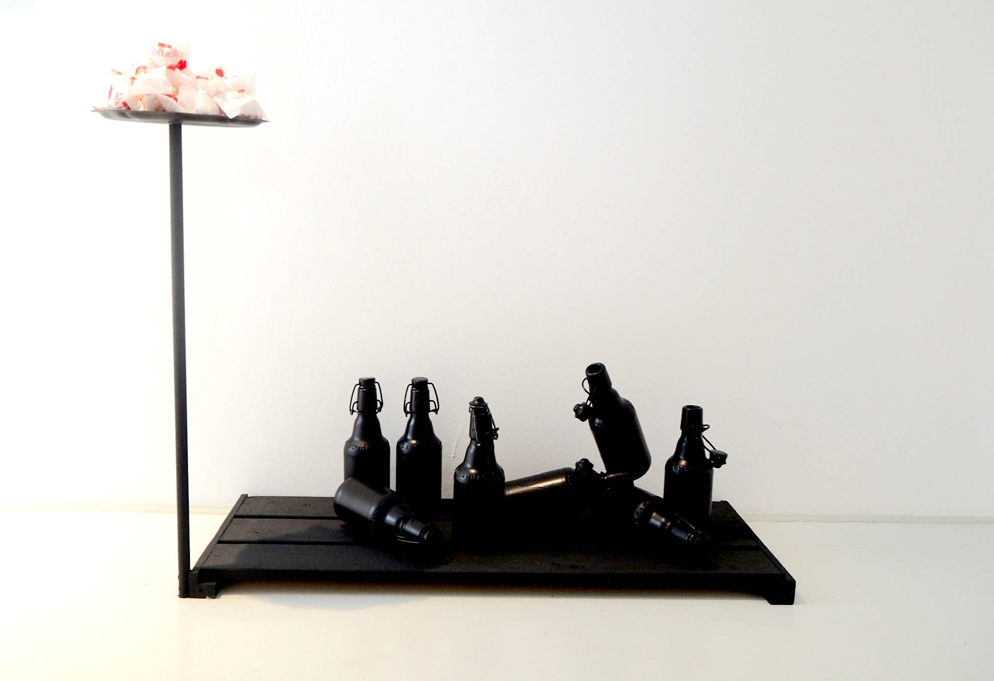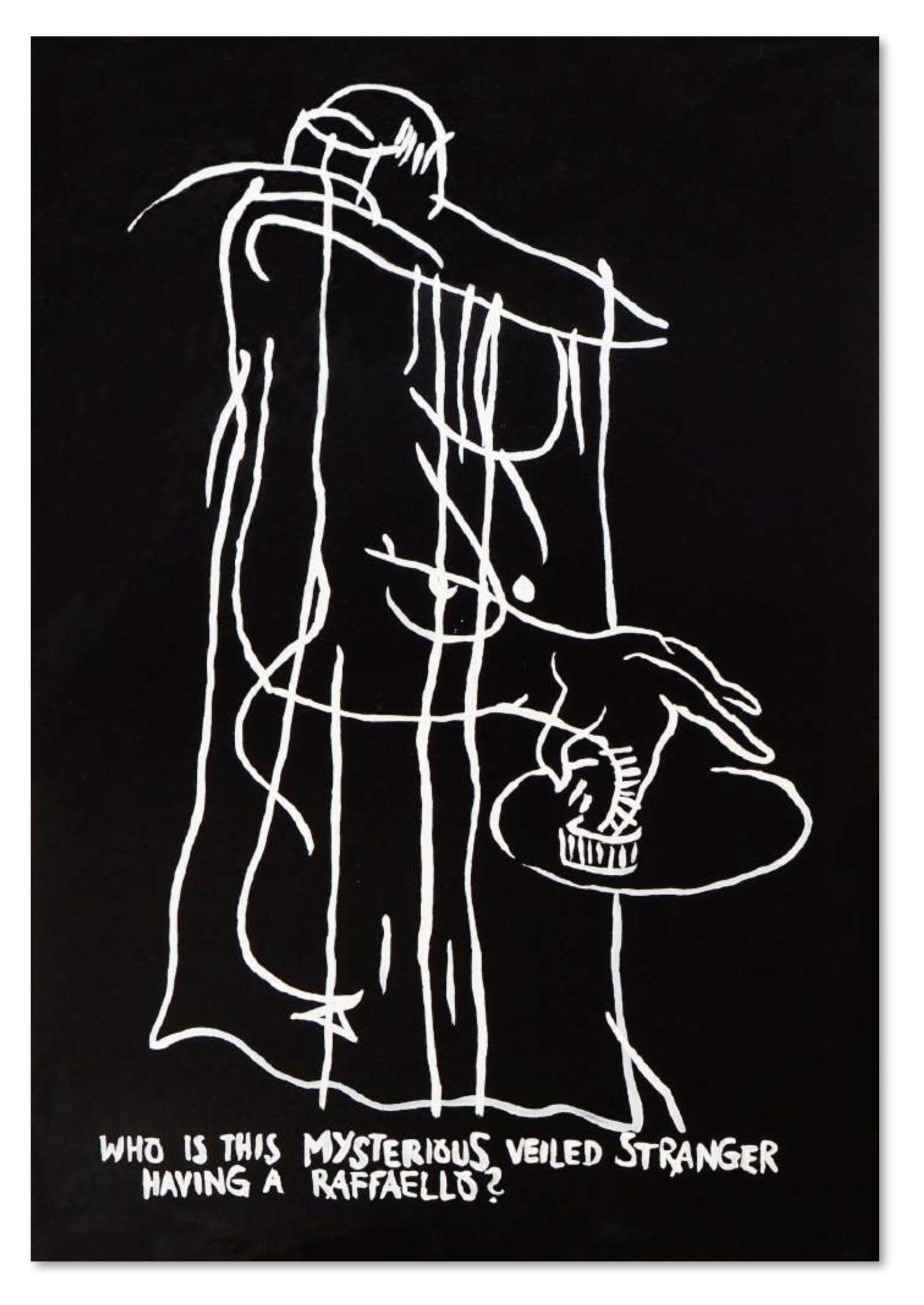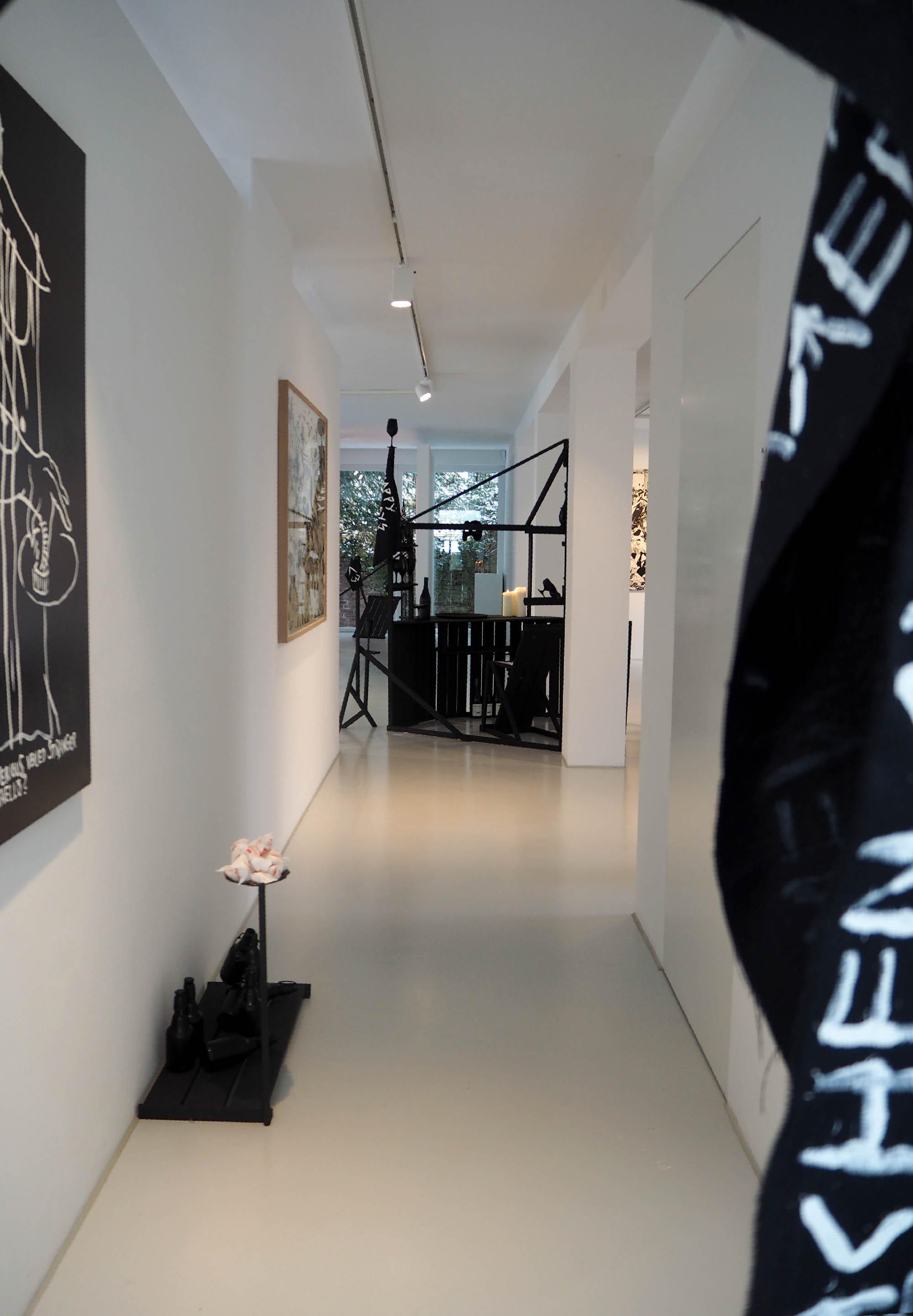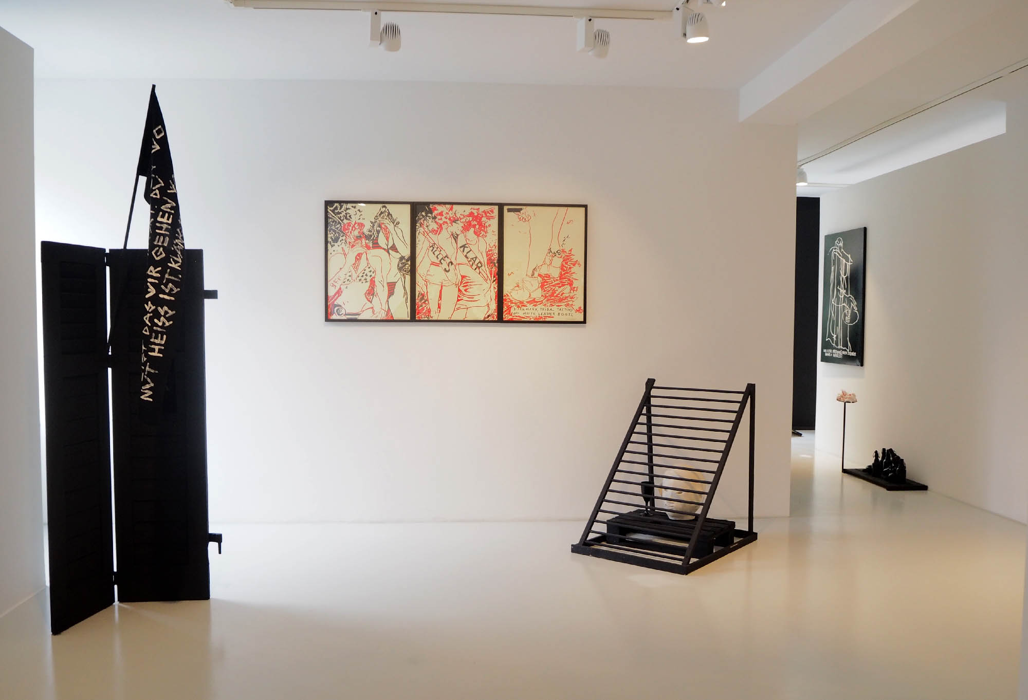 Black colour lines, quickly, unclean and occasionally with solidly material density applied, branches to abstract forms by closer examination and only matures into more specific images with increasing distance. Although the scenery then can be deciphered clearer, it isn’t more tangible. Agglomerations of people, whose faces are distorted, seem to be cooped up within the artwork frames, like in a very confined space. Only slowly it is possible to identify individual scenes, as settings over settings merge together, like a big party where you try to find your lost companion. In general the scene seems to imitate a perfect moment, which is positive, exaggerated joyful and most of all decadent. Happy Holidays Forever – as the title of the exhibition indicates, the viewer finds himself situated within a venue full of lust, luxury and enthusiasm. But with a closer look, the event becomes fragile and the figurative image breaks up into rough, uncontrolled lines.
