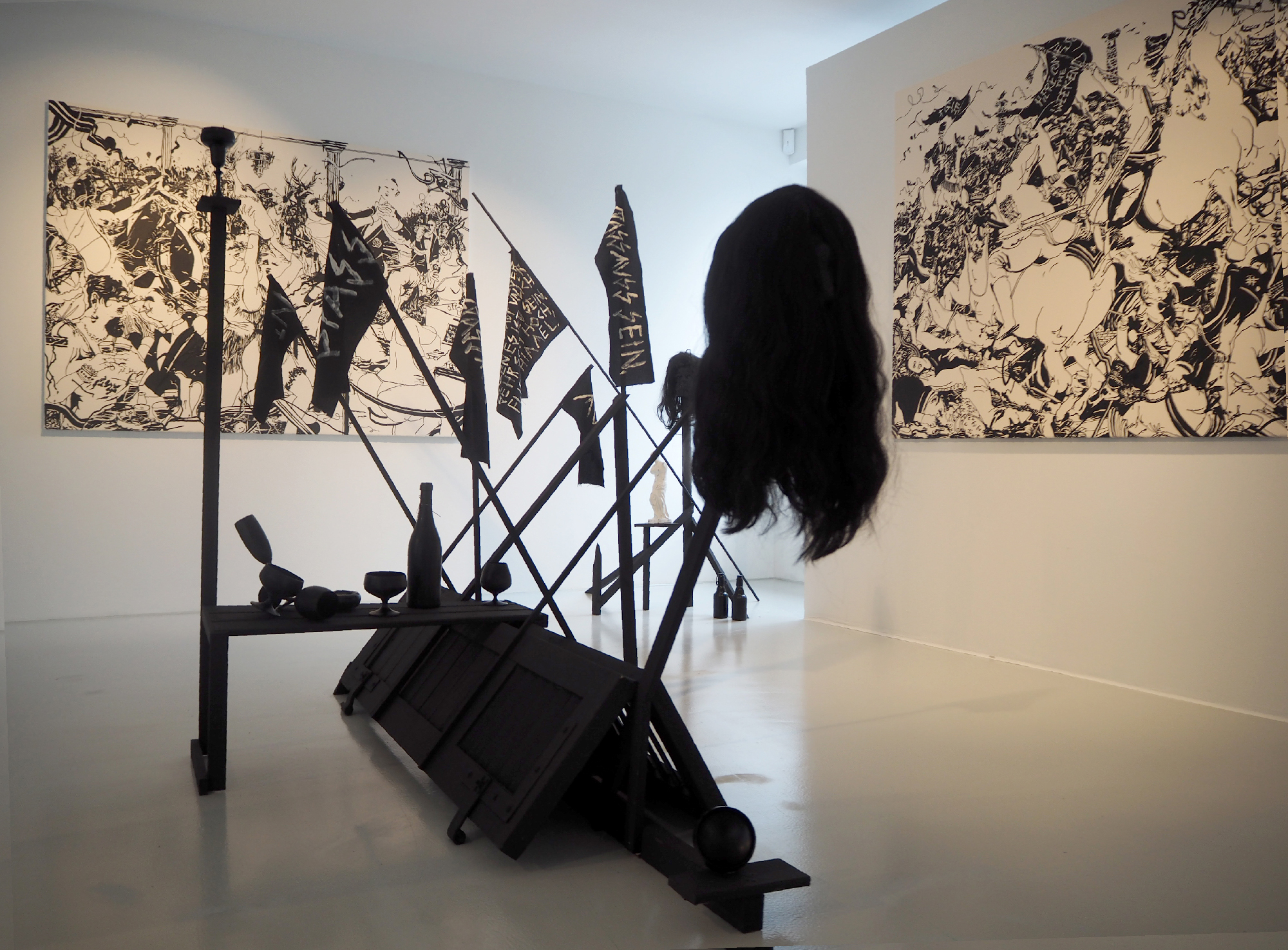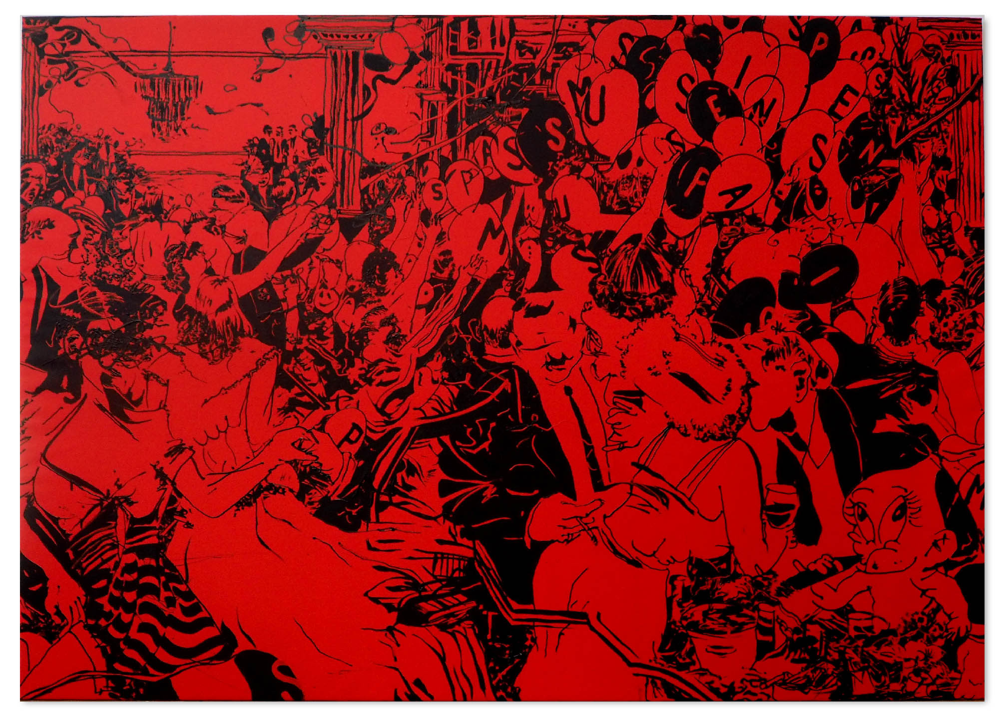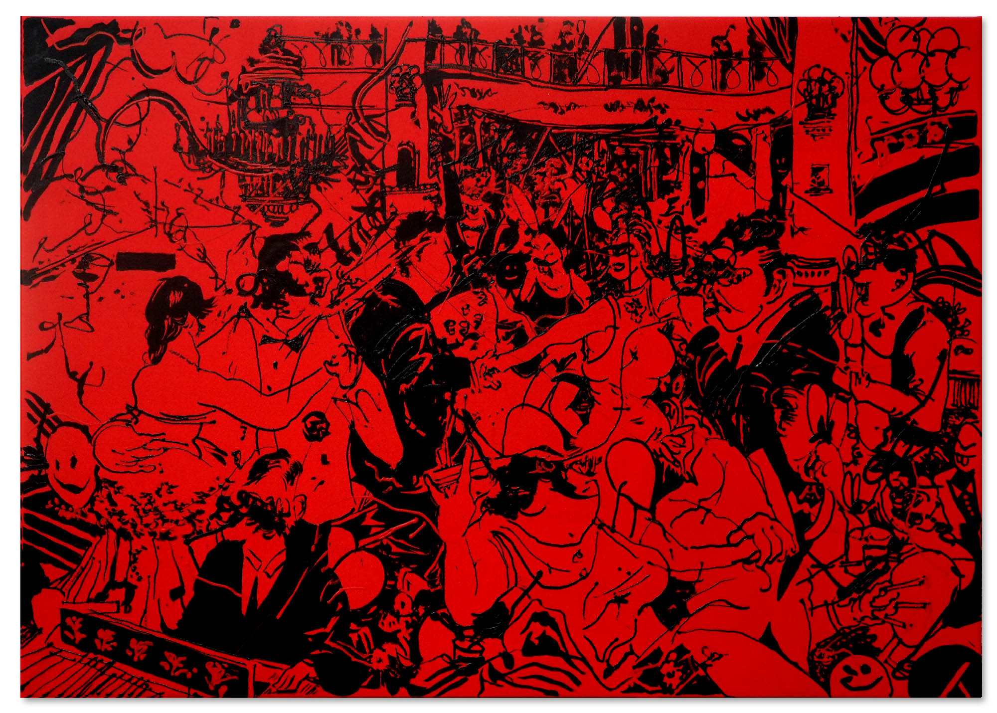 The German artist Wayne Horse (1981), also known as Willehad Eilers, tries to highlight this exact complexity and paradox within his artistic work. The Amsterdam based artist deals with the ambivalent wealth of the western society for a longer period now – the “wallowing of pigs in paradise”, as Eilers says. “The wealth and the material abundance of human beings today left marks in their self-perception. When there are no serious problems, when there is nothing left to wish for, it can’t get worse.” What is left is the very own self-optimization and self-realization. But the range of what is offered as successes or as a ‘fulfilled life’ is limited. Oneself and every moment has to be special, the documentation of it gets fed to the internet (un)filtered. Photographic evidences replace inner feelings of beauty or pain. By looking at social media the bitter taste of the feeling that everyone enjoys a continual, ever lasting vacation – a reckless moment – remains. Wayne Horse’s contextual themes and his pictorial technique, which brings up this composition of lines, emphasize how fragile this journey is. Although Eilers paints almost entirely with the colour black, he isn’t so pessimistic as it seems. His line control presents a former joie de vivre, where it is all about confidence and taking risks. The artist worked on this technique for 10 years and painted 2,5 years totally blind. That’s how he learned to trust his hand without controlling it with his eyes. Now there are lines that represent his inner self, his feelings and do not just show what he is able to do because of hard work and talent. The lines provide a comment about the illustration and aren’t just an aesthetic advertisement. For this exhibition Eilers moreover makes a marginal note by choosing striking background colours as “Champagne” and “Alert Red”. Colours that stand for luxury, fun and pomp, but also for excess, ignorance and loss of control. Sure is that the viewer is allowed to approach the artists scenery with humour and irony, as the cheerful oversubscription marks an elementary aspect of his artworks to break the spell between viewer and object and to initiate the dialogue.