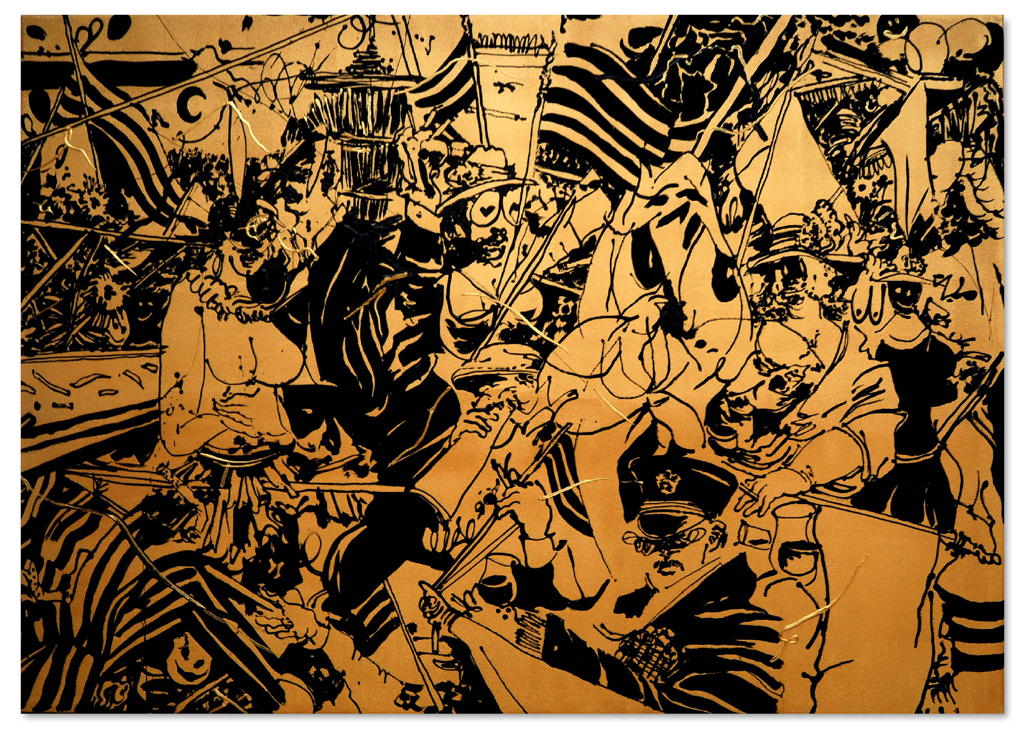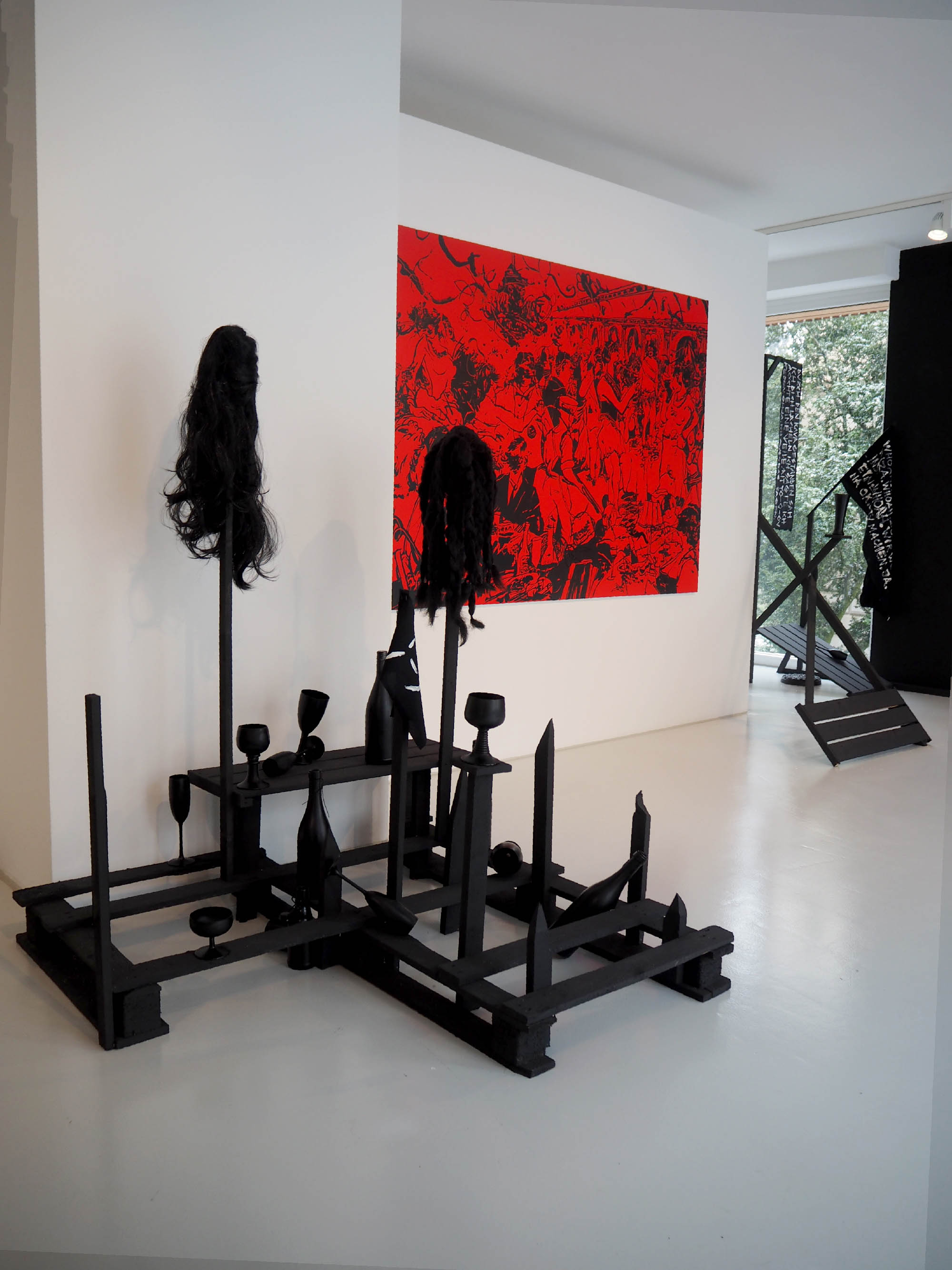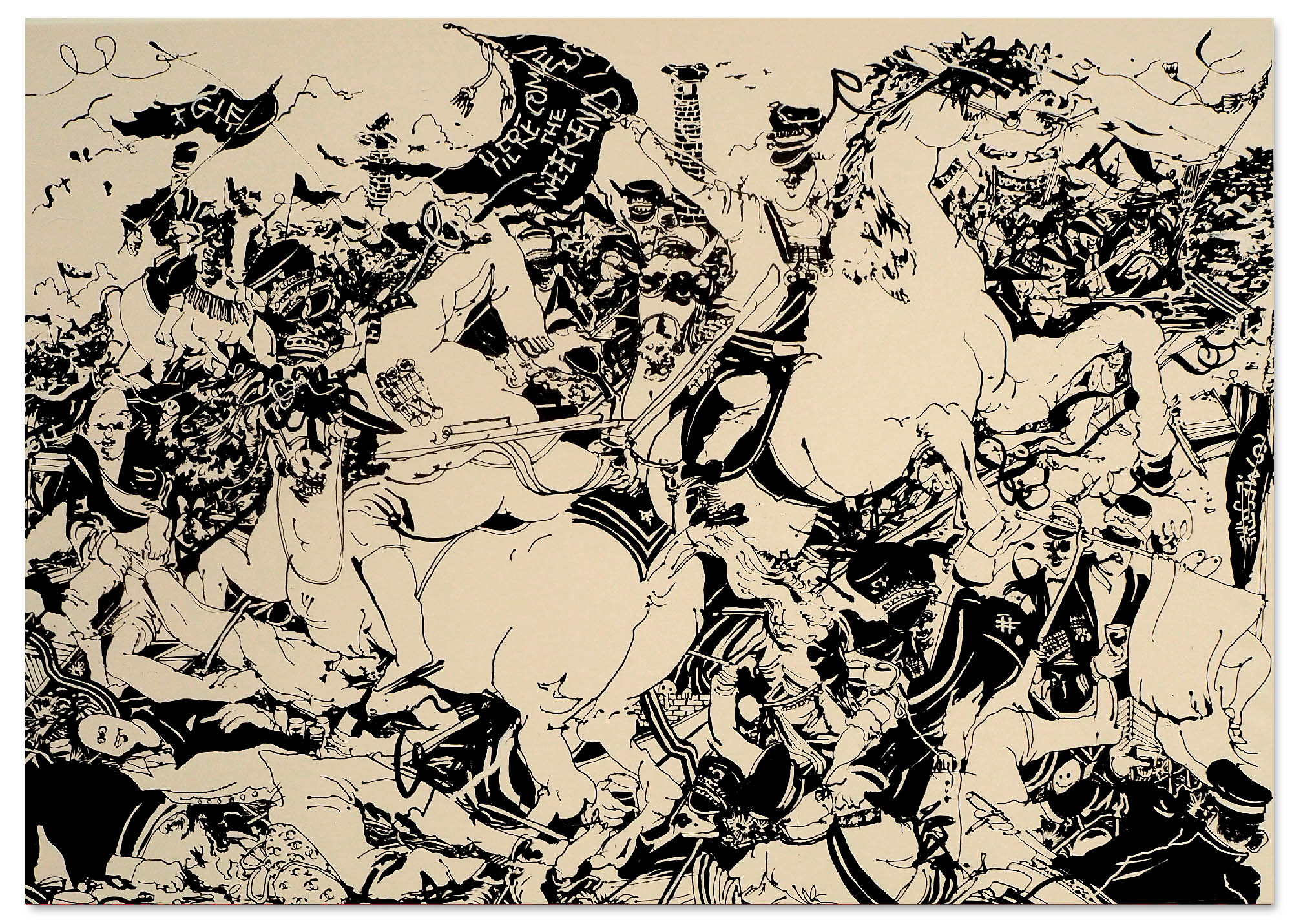 The German artist Wayne Horse (1981), also known as Willehad Eilers, tries to highlight this exact complexity and paradox within his artistic work. The Amsterdam based artist deals with the ambivalent wealth of the western society for a longer period now – the “wallowing of pigs in paradise”, as Eilers says. “The wealth and the material abundance of human beings today left marks in their self-perception. When there are no serious problems, when there is nothing left to wish for, it can’t get worse.” What is left is the very own self-optimization and self-realization. But the range of what is offered as successes or as a ‘fulfilled life’ is limited. Oneself and every moment has to be special, the documentation of it gets fed to the internet (un)filtered. Photographic evidences replace inner feelings of beauty or pain. By looking at social media the bitter taste of the feeling that everyone enjoys a continual, ever lasting vacation – a reckless moment – remains. Wayne Horse’s contextual themes and his pictorial technique, which brings up this composition of lines, emphasize how fragile this journey is. Although Eilers paints almost entirely with the colour black, he isn’t so pessimistic as it seems. His line control presents a former joie de vivre, where it is all about confidence and taking risks. The artist worked on this technique for 10 years and painted 2,5 years totally blind. That’s how he learned to trust his hand without controlling it with his eyes. Now there are lines that represent his inner self, his feelings and do not just show what he is able to do because of hard work and talent. The lines provide a comment about the illustration and aren’t just an aesthetic advertisement. For this exhibition Eilers moreover makes a marginal note by choosing striking background colours as “Champagne” and “Alert Red”. Colours that stand for luxury, fun and pomp, but also for excess, ignorance and loss of control. Sure is that the viewer is allowed to approach the artists scenery with humour and irony, as the cheerful oversubscription marks an elementary aspect of his artworks to break the spell between viewer and object and to initiate the dialogue.